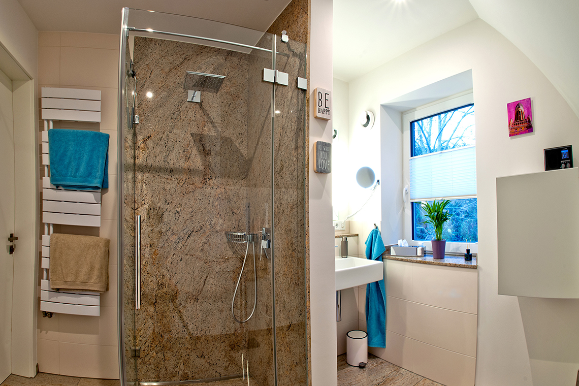 ist mit großformatigem Granit auf den Fußböden und in der Dusche deckenhoch mit ganzen Platten belegt. Die Regenschauer-Kopfbrause in der rahmenlosen Ganzglas-Duschkabine mit Bodenablauf sorgt für höchsten Komfort. Design-Waschbecken (Duravit Vero Air), spülrandlose Villeroy & Boch-Toilette/Deckel mit Absenkautomatik, LED-Spiegel, beleuchteter hochwertiger Kosmetik-Vergrößerungsspiegel, Seifenspender, Föhn, Körperfettwaage mit BMI-Anzeige, Premiumhandtücher, einseitig offener Design-Handtuchheizkörper zum einfachen Ablegen der Badehandtücher sowie ein Internet-Radio mit Gute-Laune-Musik und Ladegerät mit einem iPhone-Ladekabel. Zur Ablage stehen Ihnen ausreichend Ablage- und Schrankfläche zur Verfügung.